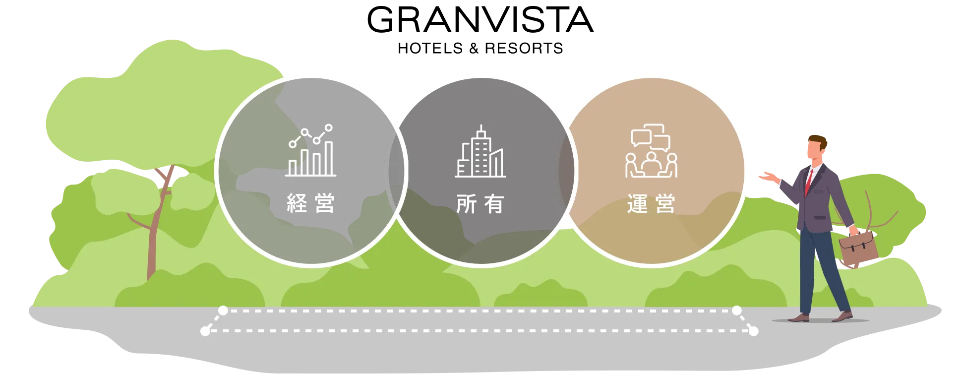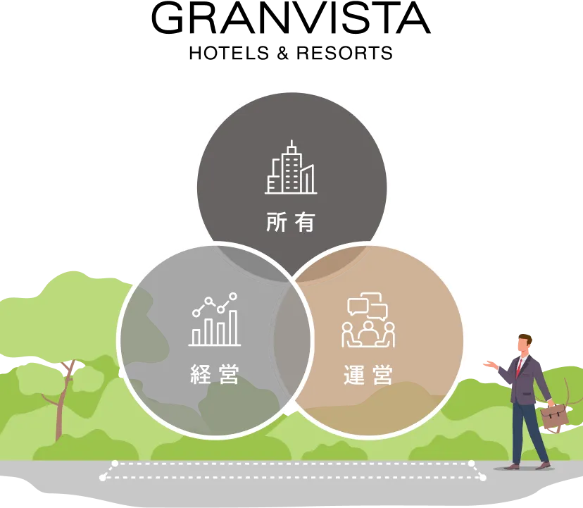施設の所有・経営と運営を分離させる事業方式で、オーナー様が所有する建物にて、豊富な経験と専門的ノウハウを持つ当社がホテル・旅館の運営を行います。あわせて当社が誇るセールスネットワークが送客を支援。ホテル・旅館経営の主体はオーナー様にあり、ホテル営業に伴う売上、経費および損失はオーナー様に帰属し、当社は該当するホテルの運営実態に応じて運営受託料等をいただきます。