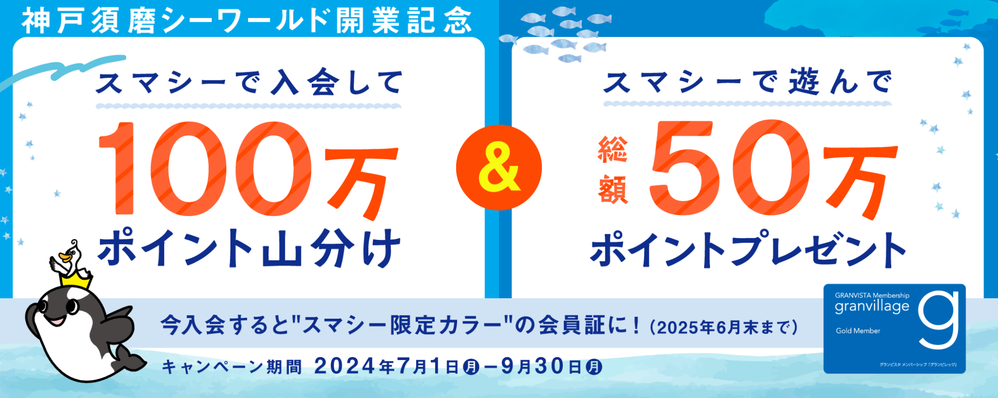 キャンペーン期間中、新規でご入会かつ「登録のきっかけとなった施設」で「神戸須磨シーワールド」を選択いただいた会員様に、【100万円分】のグランビレッジポイントを山分けプレゼントいたします!