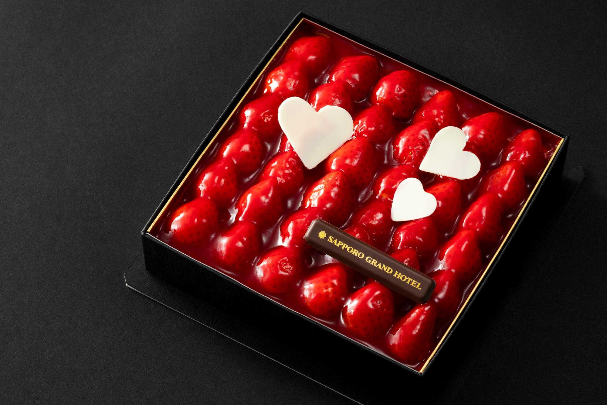 箱を開けた瞬間の華やかなサプライズ。レアチーズケーキの上に苺を敷き詰め、ホワイトチョコレートのハートをアクセントにしました。
