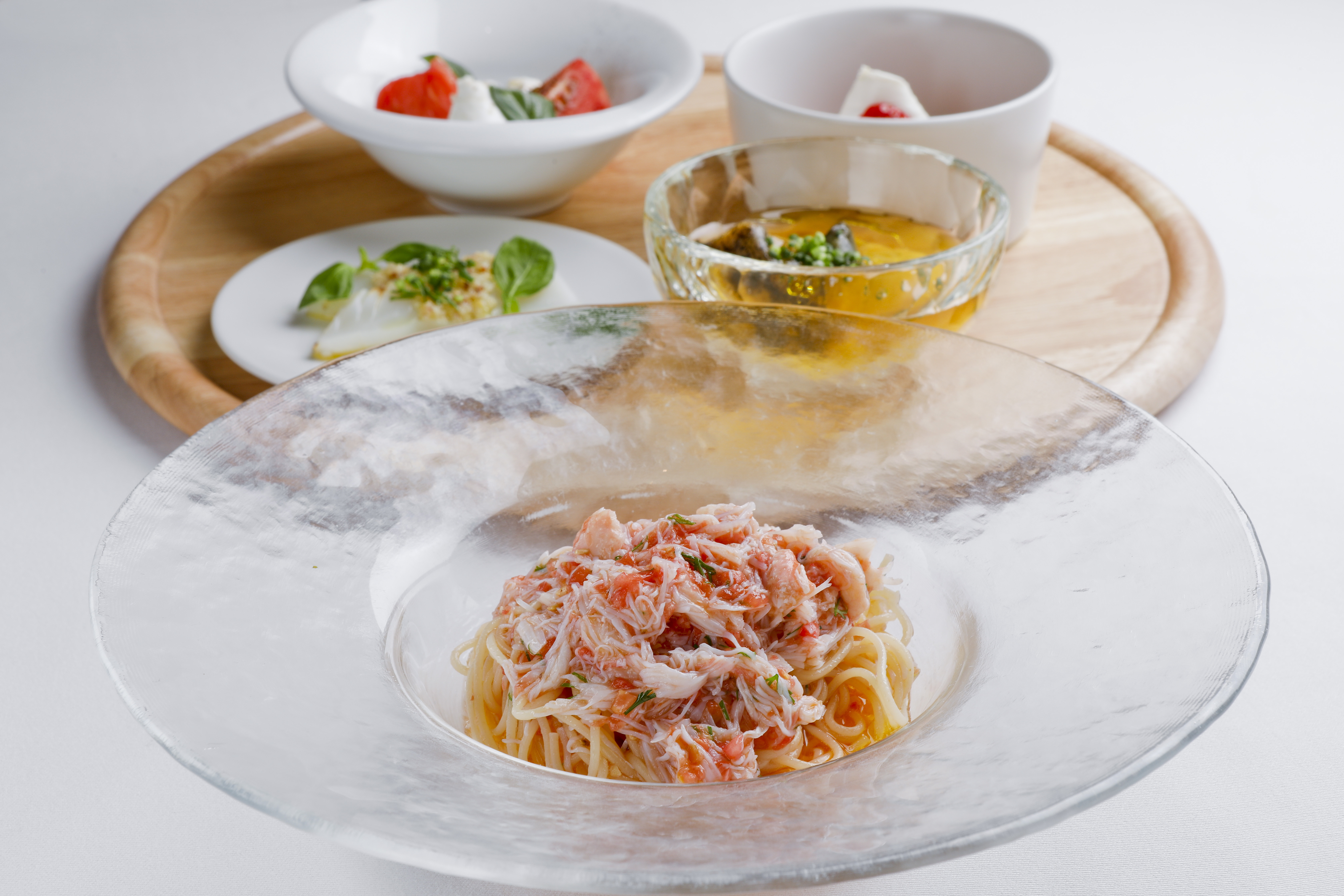 「カンティーナ・アルバロンガ」 の看板メニュー 紅ズワイガニとフルーツトマトの冷製パスタなど含む全5品