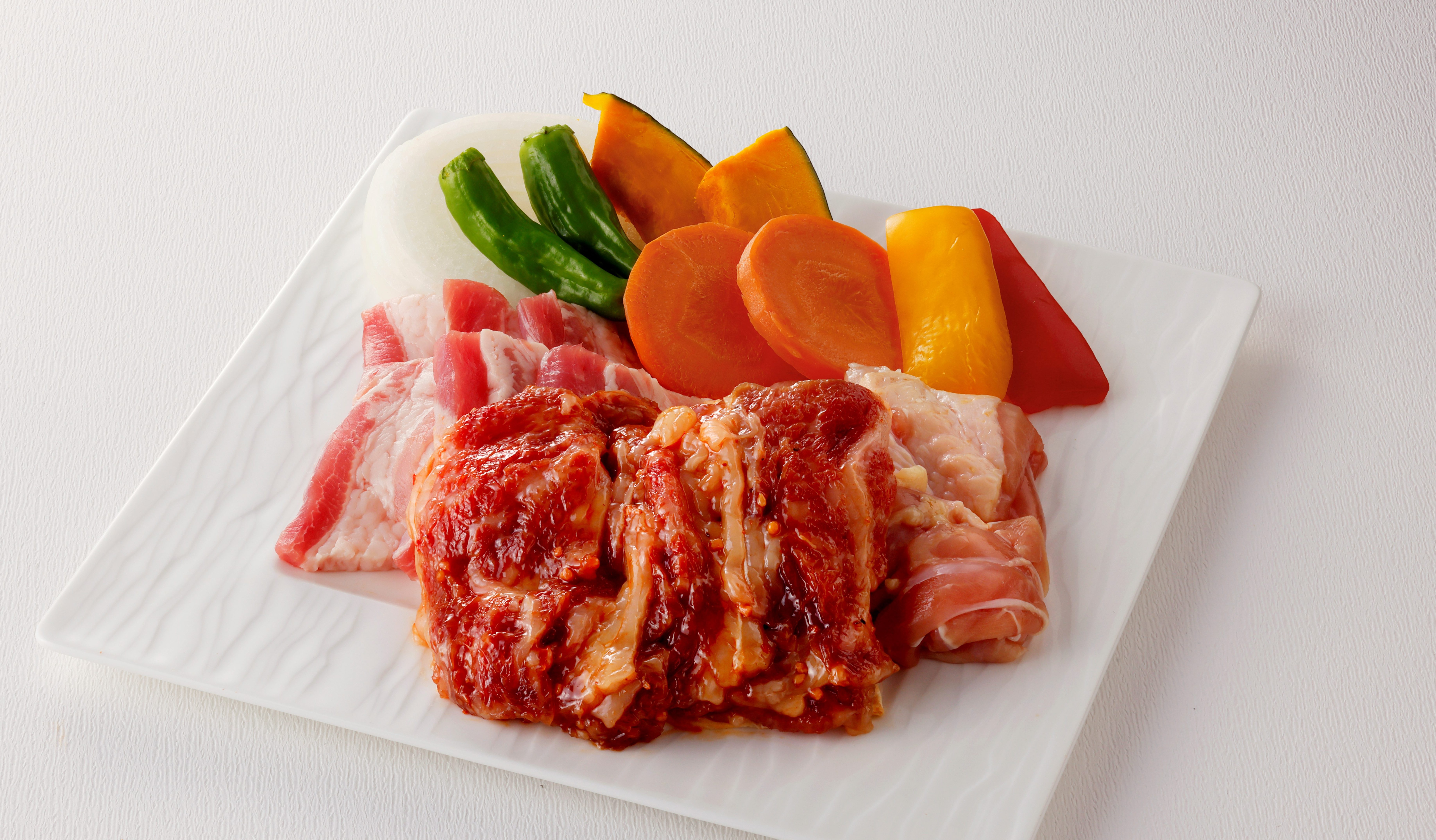 内容:和牛カルビ、オランダ風車豚ばら肉、鶏肉 各150g、野菜盛り合わせ