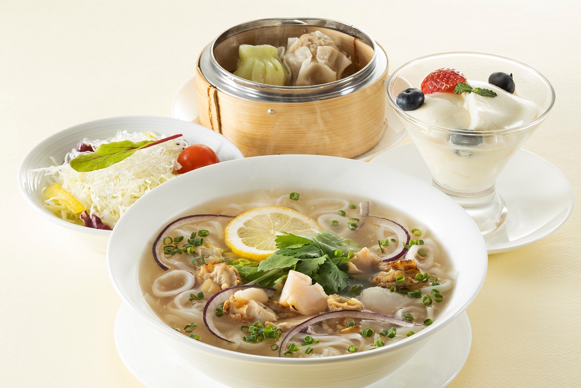 ・メニュー例:帆立貝と海の幸のライスヌードル アジアンテイスト、点心二種盛り合わせ 他