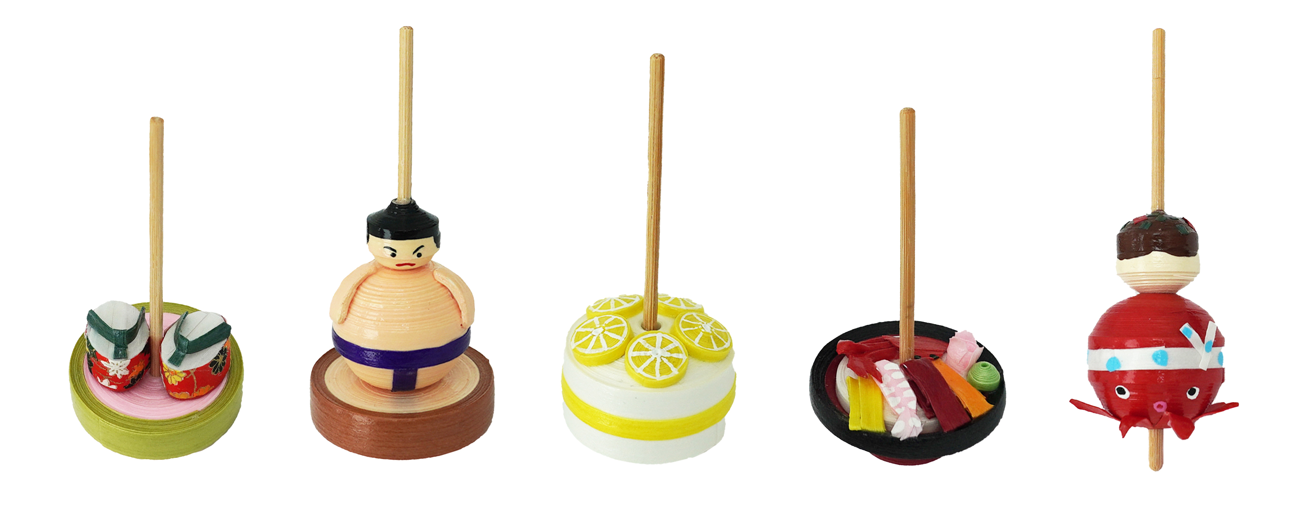 大阪のソウルフードといわれる粉もん料理のなかでも、お好み焼きと並んで人気の高い「たこ焼き」。今回は頭にハチマキを巻いた愛嬌あるタコチャンの上に、まんまるなたこ焼きが乗った、インパクト抜群の京こまを制作いただけます。