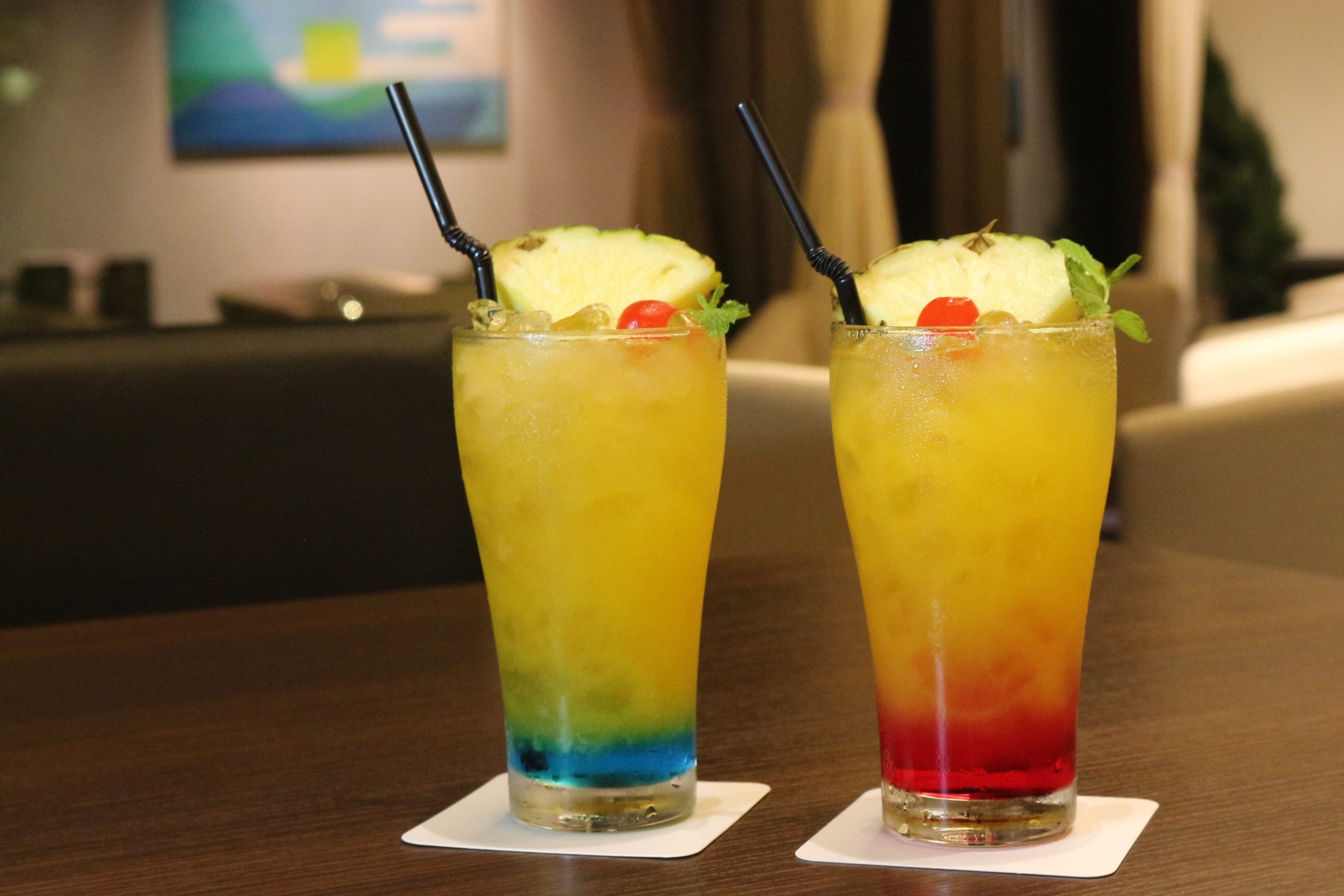 夕景の名所として知られる白浜町の「円月島」を、パイナップルとチェリーで表した一杯。ゆったりとしたラウンジでお楽しみください。