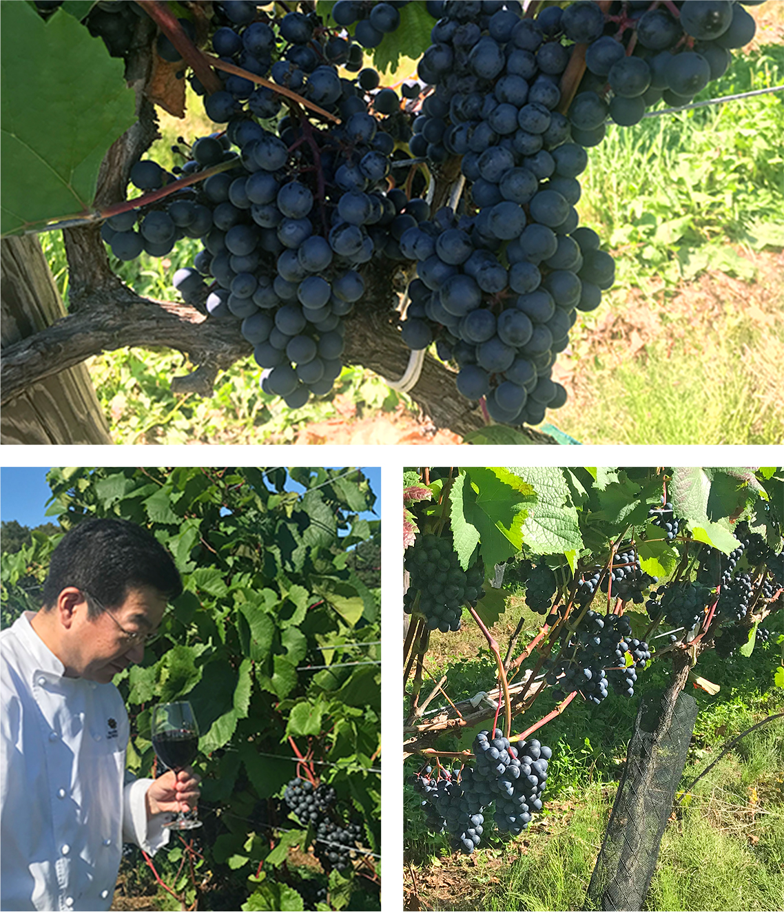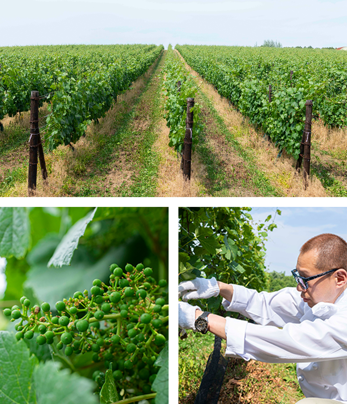 北海道とはいえ、気温が30度を超える盛夏、日当たりの良いぶどう畑で一房一房、ぶどうの花殻を落とす作業に没頭するスタッフ。「畑でぶどうのお世話をしながら、このワインにはどんな料理を合わせようかと思いを巡らせています」と、額に汗しながらも、その表情はどこか楽しそうです。